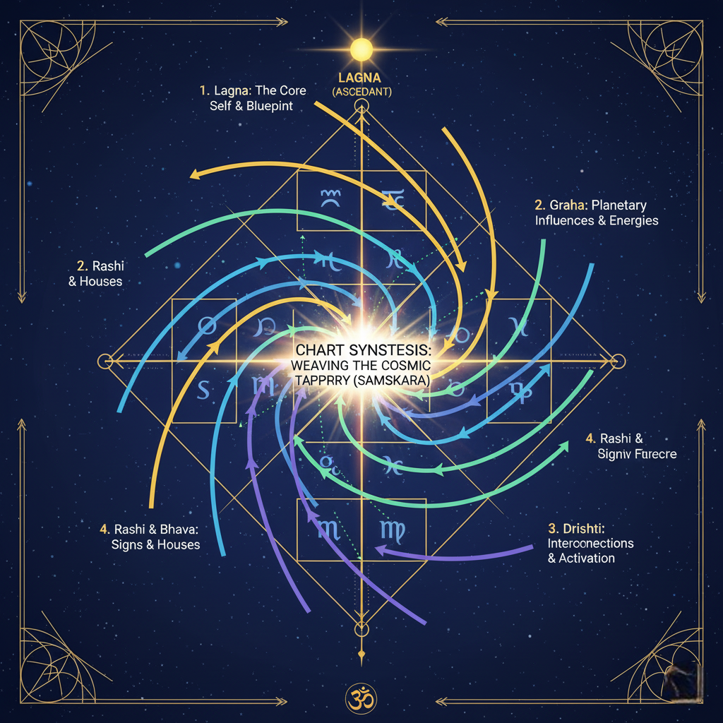 You’ve learned about houses, planets, signs, aspects, conjunctions, and dignities. But when you open a full Vedic chart — with all those symbols and numbers — it can still feel overwhelming. How do you connect it all? Welcome to the art of chart synthesis — the process of weaving together all the individual threads of astrology into one meaningful story.