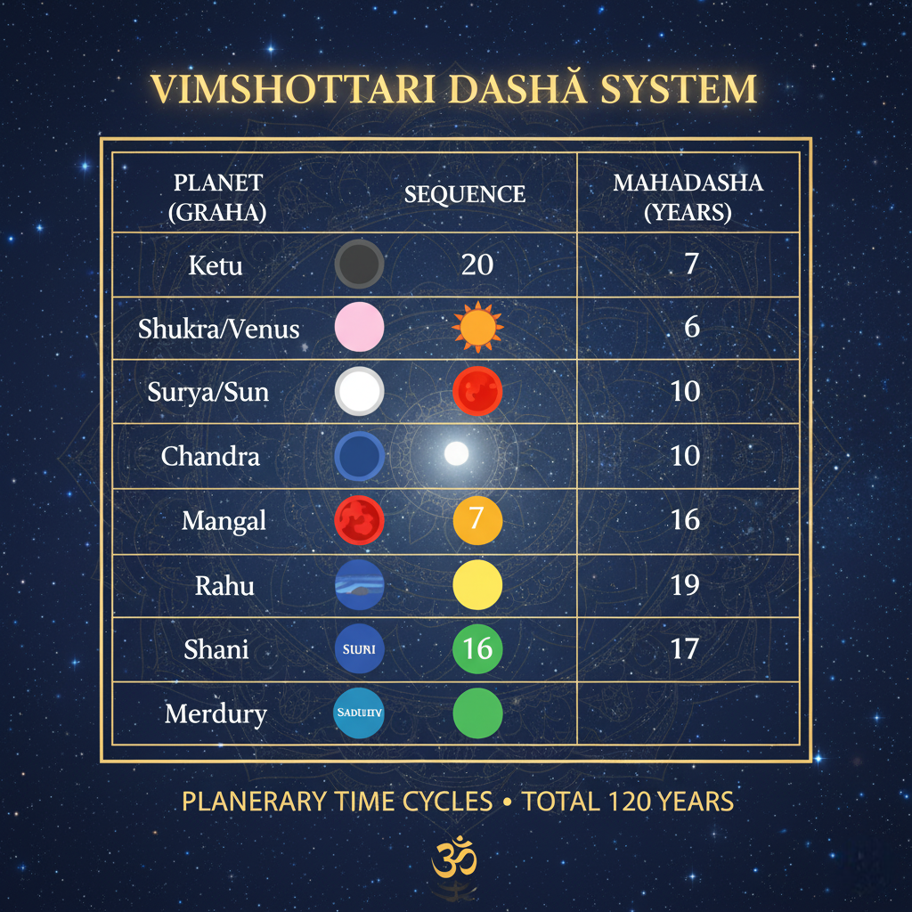 In Vedic astrology, the Dasha system is one of the most powerful timing tools. It divides your life into planetary periods, each ruled by a specific planet. The most widely used system is the Vimshottari Dasha, which assigns fixed durations to the nine planets (Navagrahas).